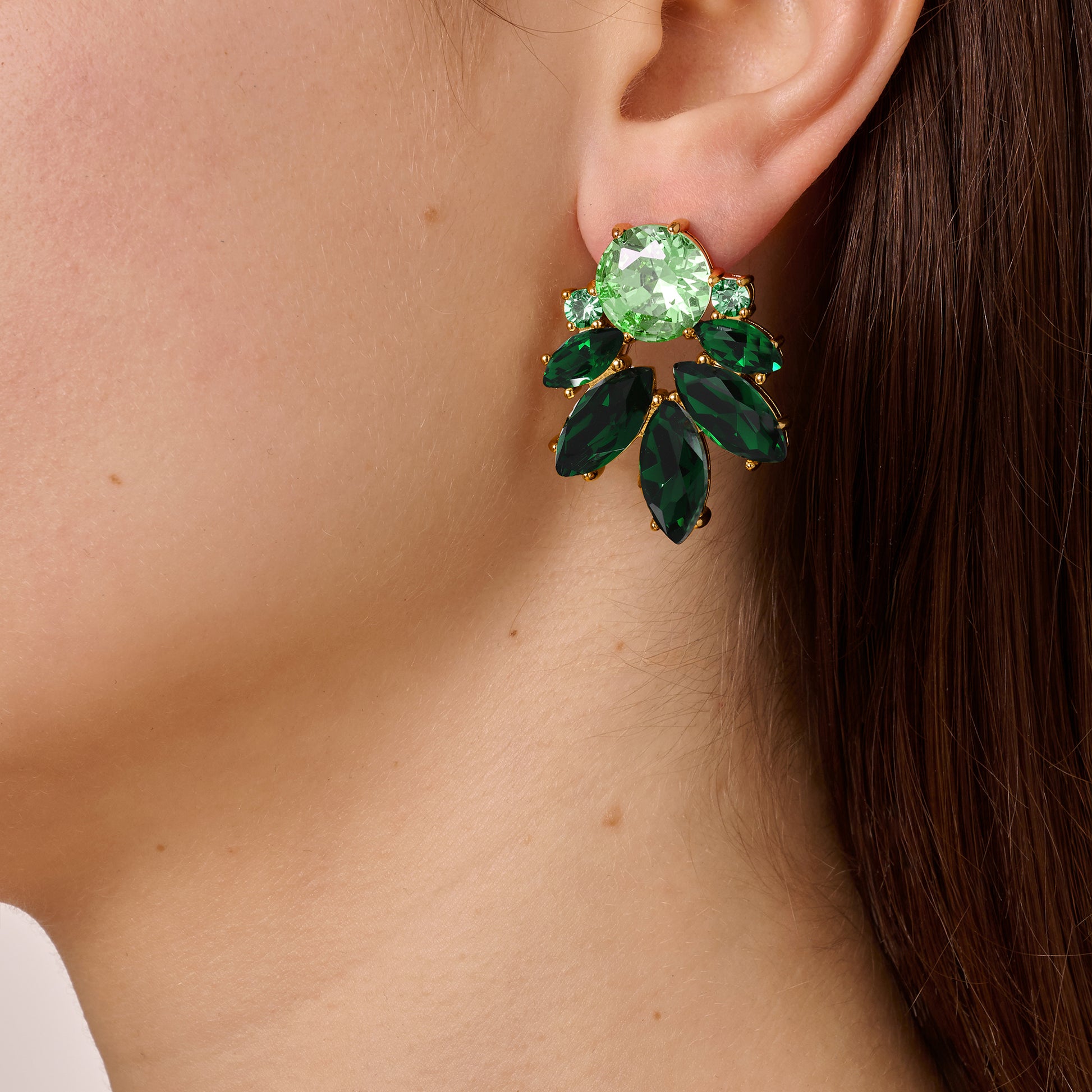 DRAGO er et øredobbdesign med en halvsirkel av bladformede krystaller som omkranser en større, rund kontrastfarget sten. Vist her i smaragdgrønne nyanser med gulltonet finish.