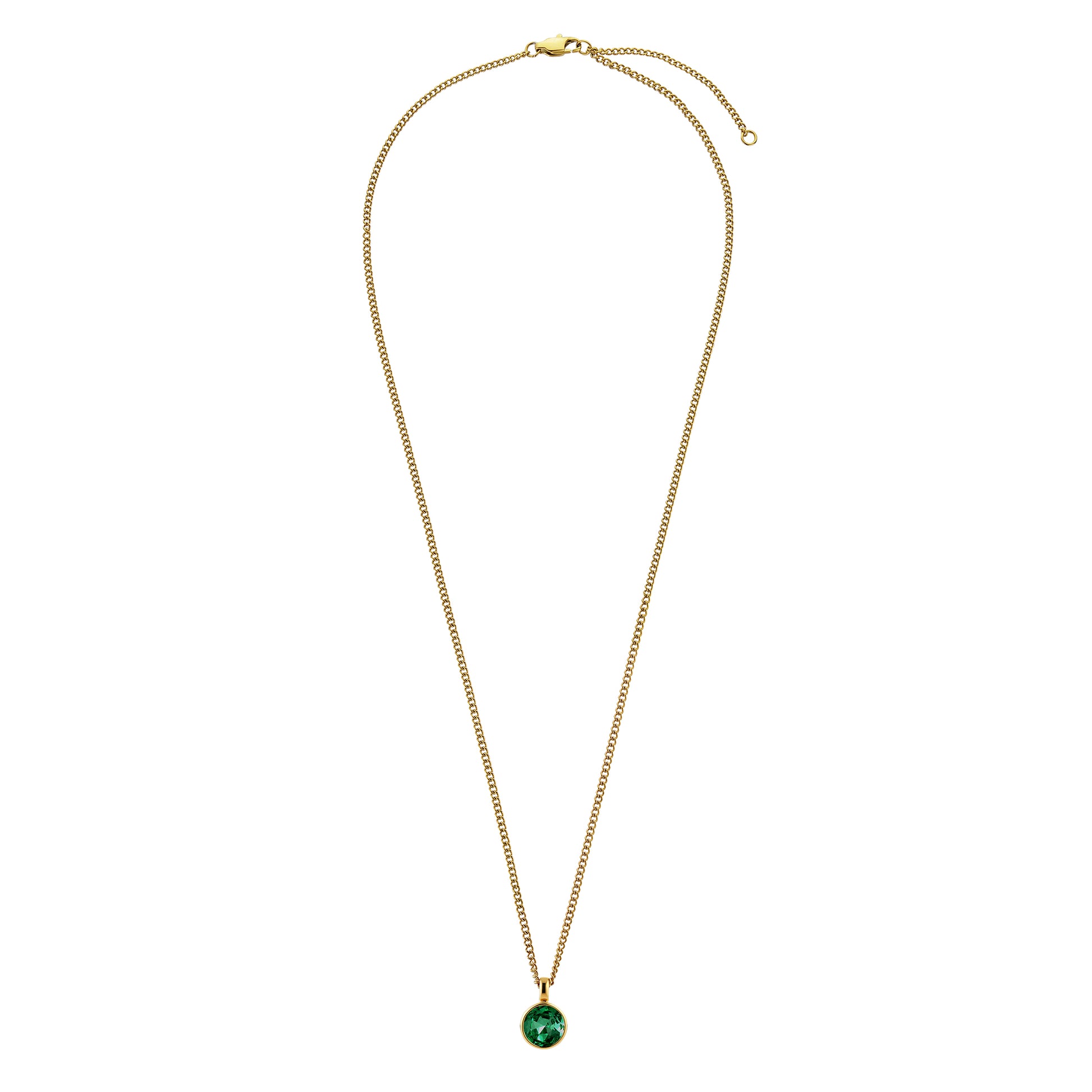 ETTE er et klassisk halskjede pyntet med en fasettslipt solitaire-krystall i en moderne boksinnfatning. Kjedet er laget i belagt rustfritt stål, er 50 cm langt og har en forlengelseskjede på 5 cm. Denne utgaven har en gulltonet finish med en dramatisk smaragdgrønn krystall.