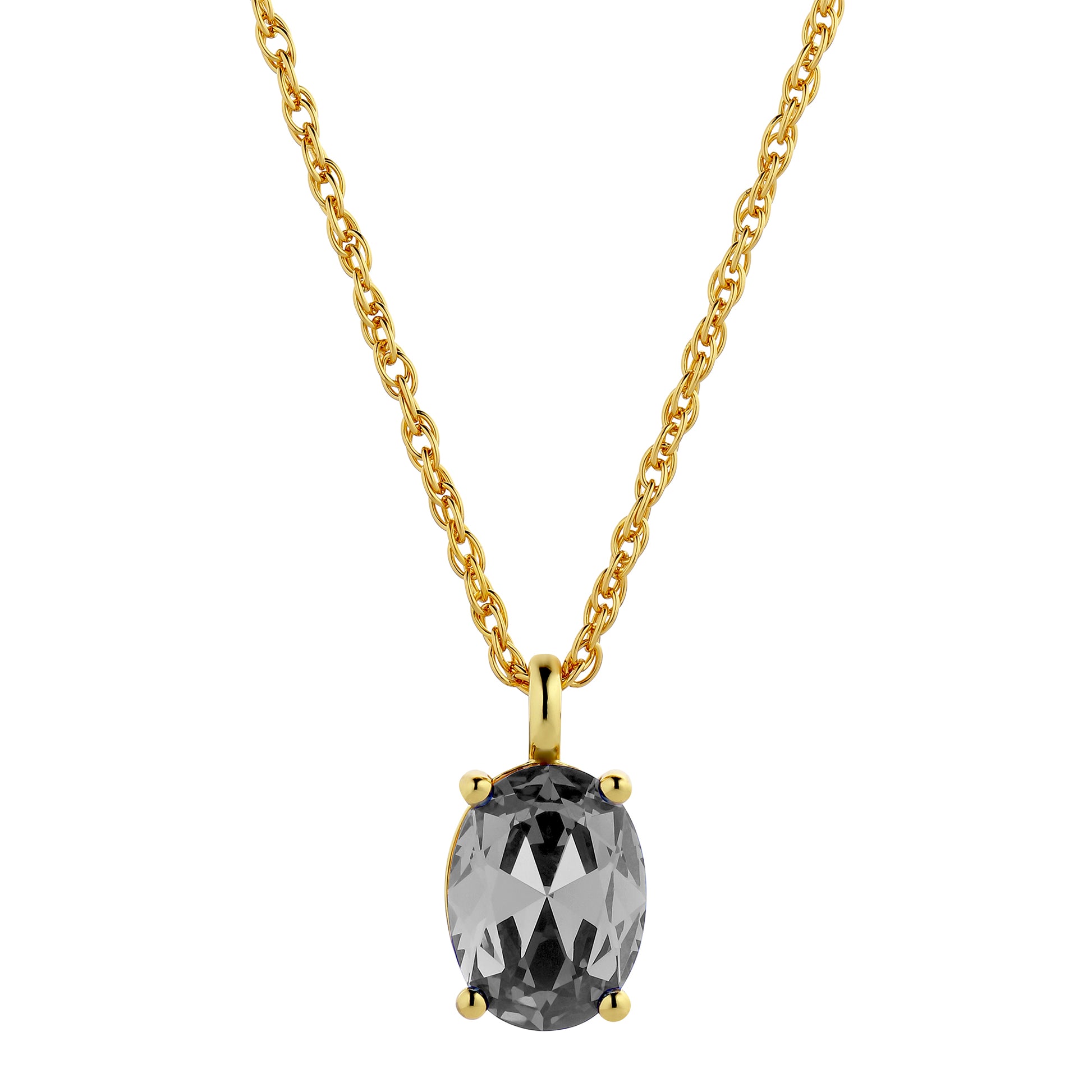 BARGA er et klassisk halskjede med en oval, glitrende fasettslipt krystall som eneste anheng. Kjedet er designet i polert stål, er 45 cm langt og har en forlengelseskjede på 5 cm. Denne utgaven har en skinnende gulltonet finish med et diskret gråtonet krystallanheng.