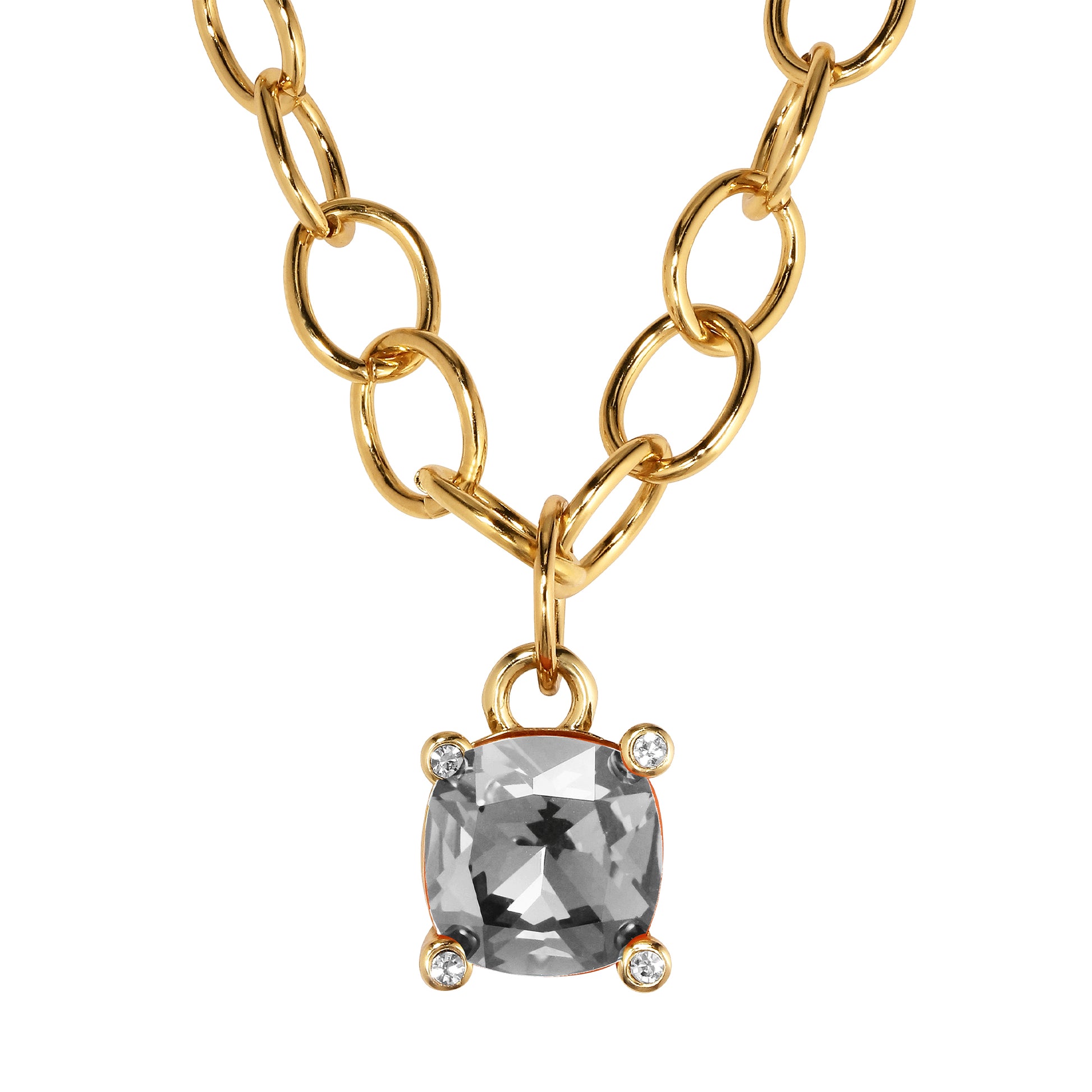 RAMINA er et halskjede med et markant anheng flankert av fire mindre kontrastfargede krystaller. Kjedet er ca. 45 cm langt med en forlengelseskjede på 5 cm, og anhenget måler ca. 18 mm i diameter. Her vist med et grått krystallanheng i gulltonet finish.