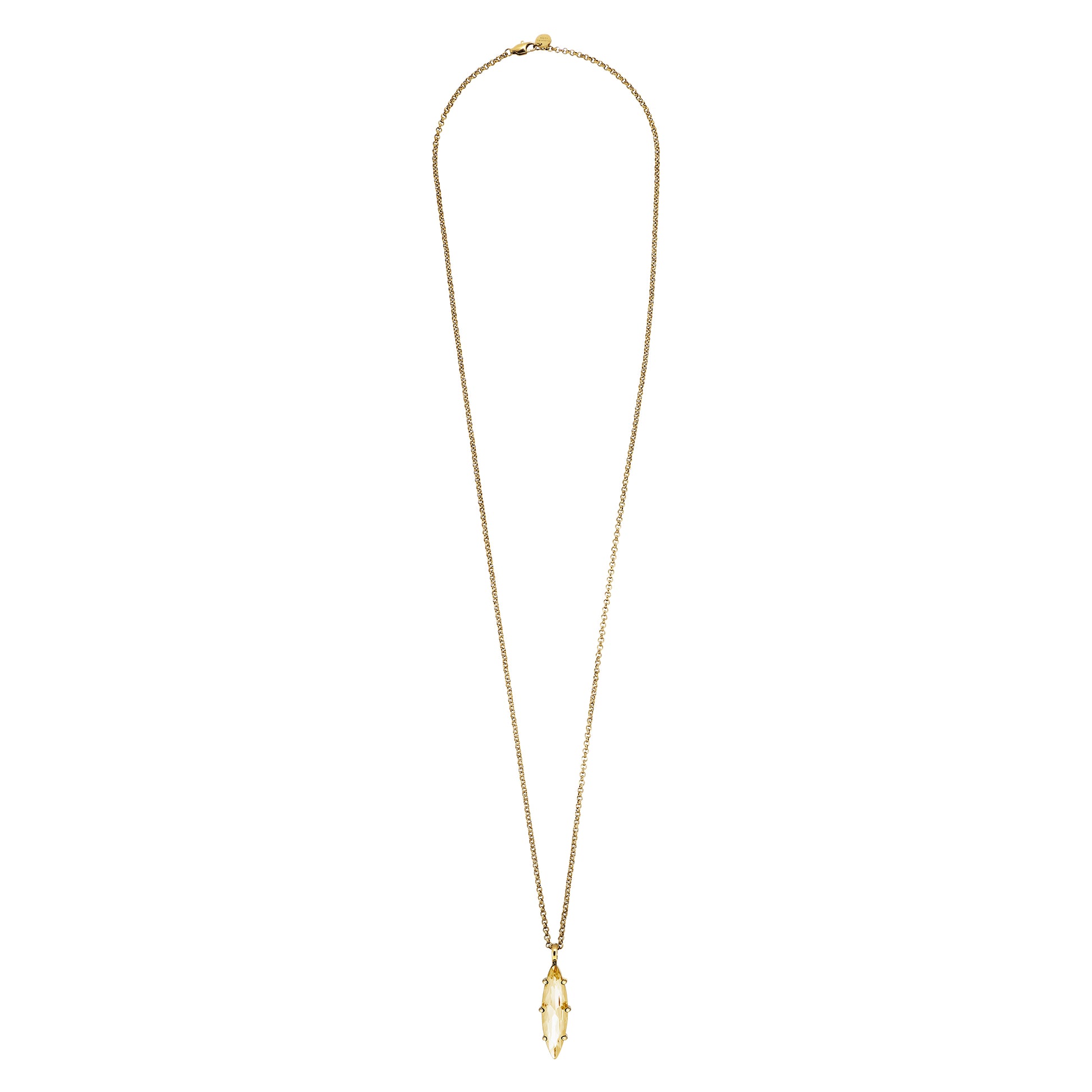 TAKESHI er et langt, enkelt halskjede på 80 cm med liten lås og et slankt bladformet anheng av fasettslipt, glitrende krystall, satt i en klassisk innfatning. Denne utgaven er designet i gulltonet messing med gylden sten.