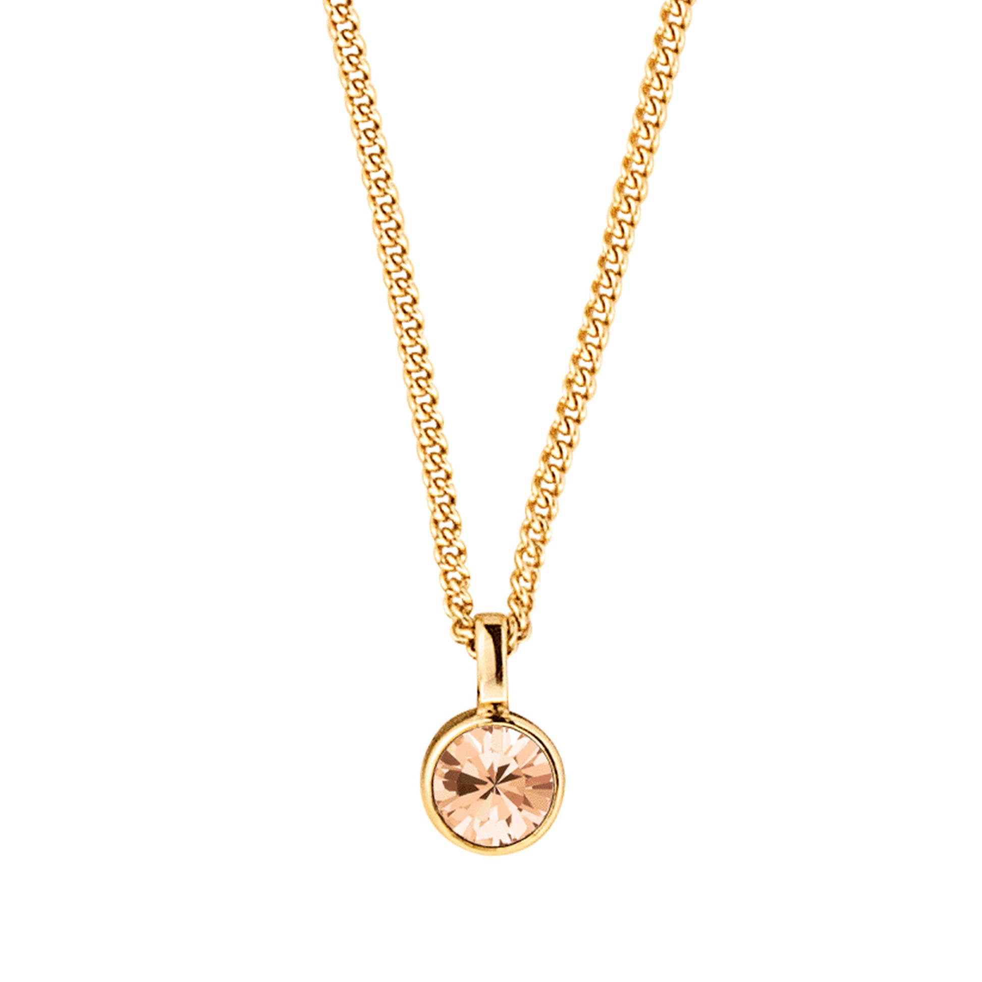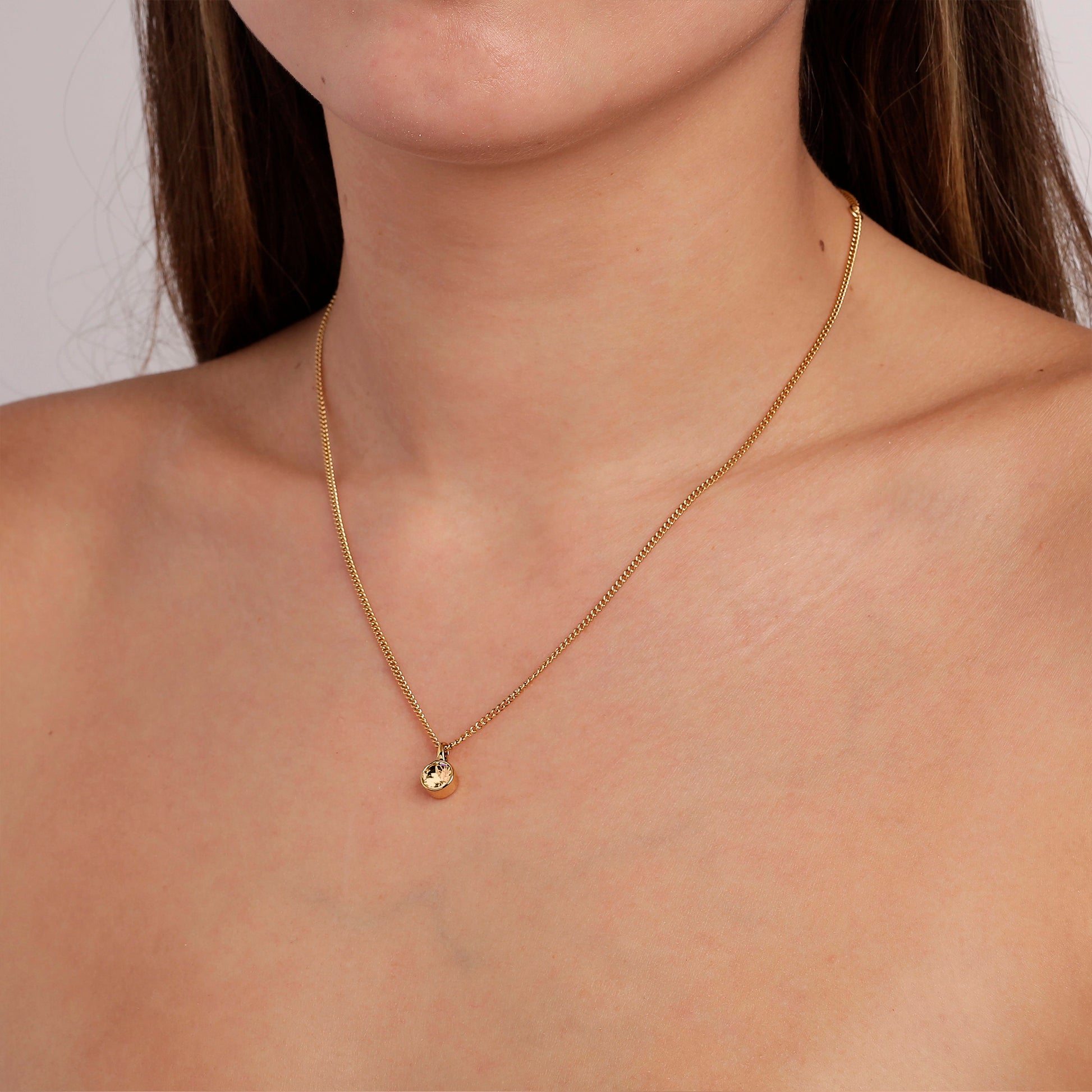 JEMMA er et klassisk halskjede pyntet med en fasettslipt solitaire-krystall satt i en moderne boksinnfatning. Her vist i en nydelig gylden variant på gulltonet finish. Lengde 45 cm + 5 cm forlengelse.