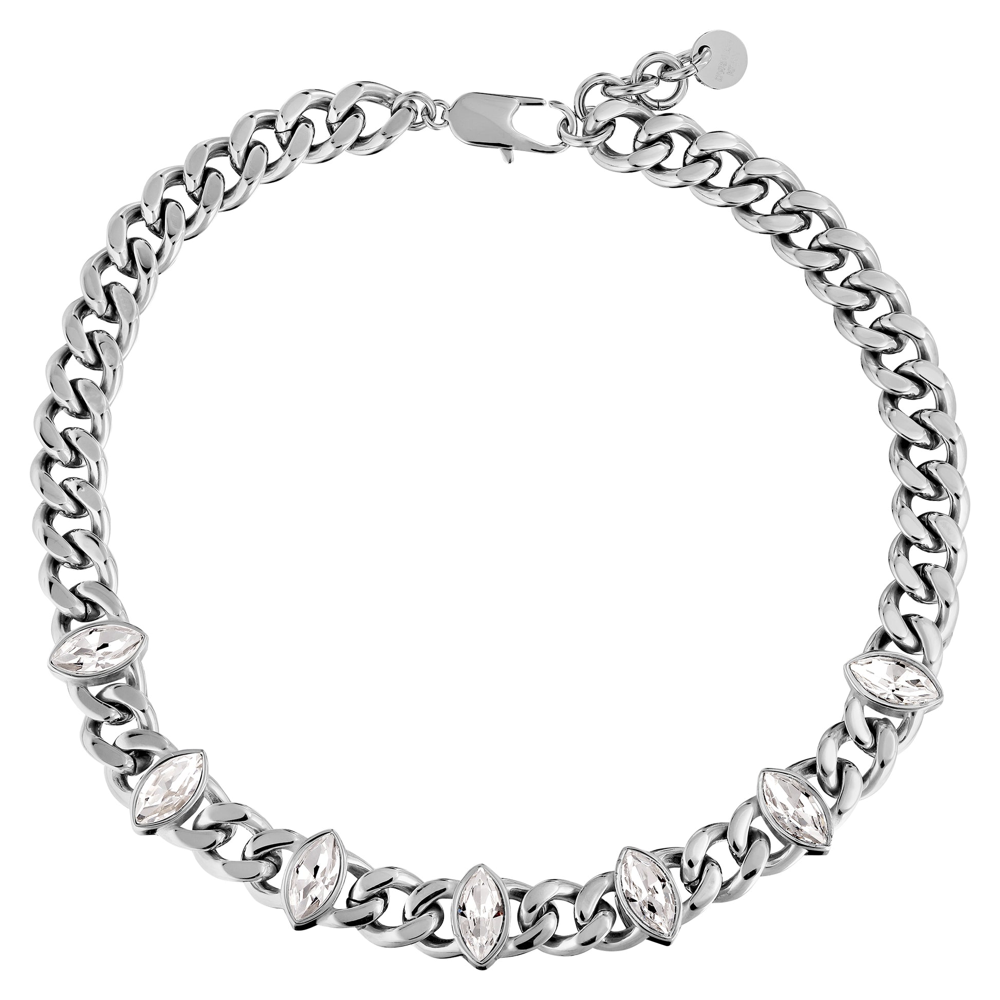 PUNICA er et kort halskjede som ligger vakkert rundt halsen med sin lengde på 42 cm + 5 cm forlengerkjede. Kjedet er designet i polert stål, med syv innlagte navetteformede krystaller. Her vises den sølvfargede versjonen med klare krystaller.
