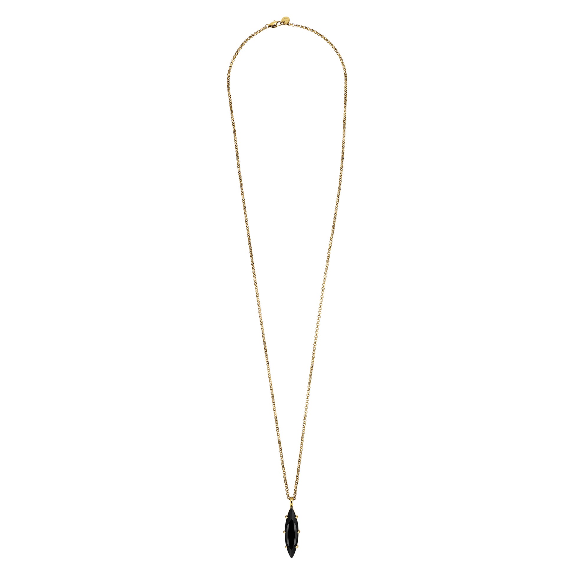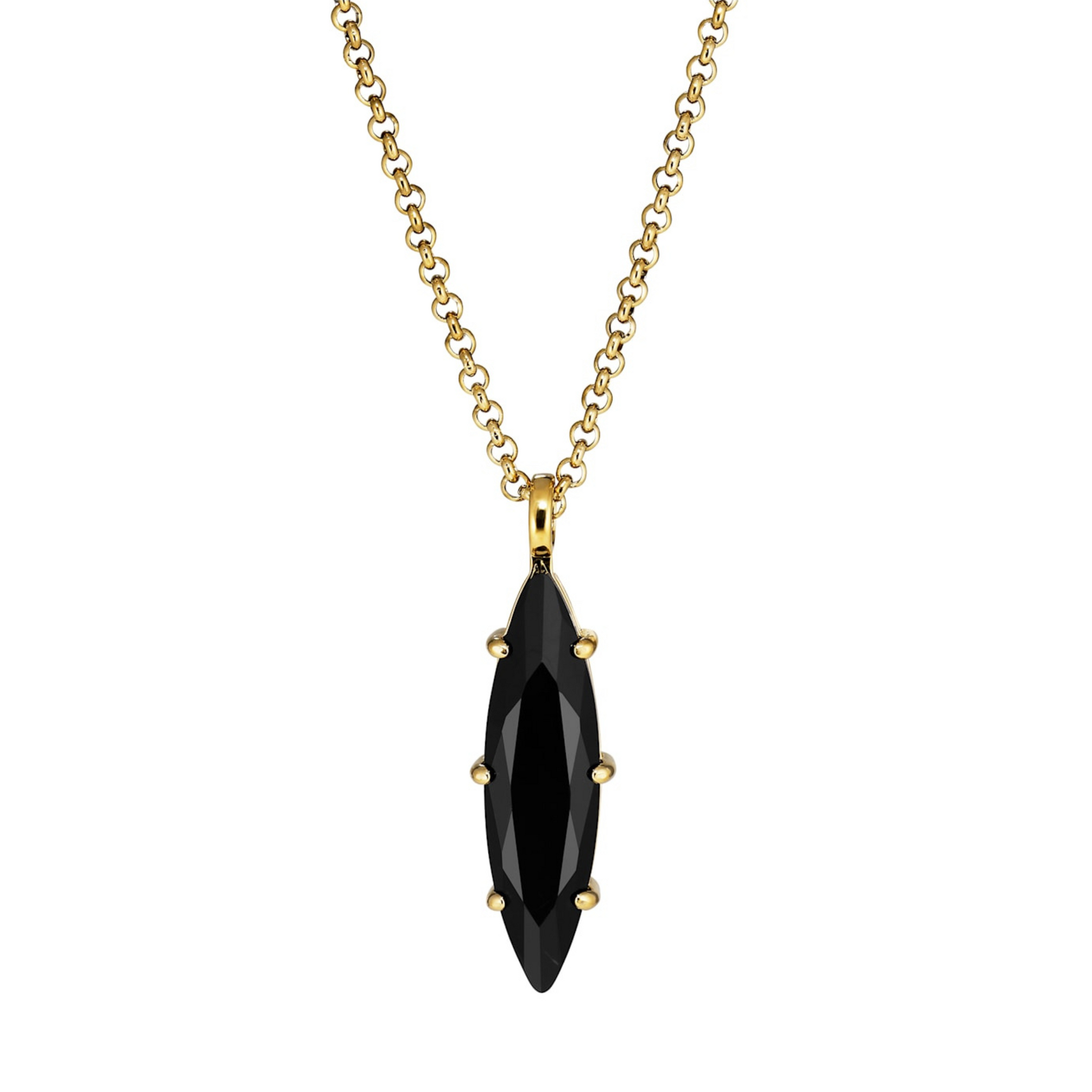 TAKESHI er et langt, enkelt halskjede på 80 cm med liten lås og et slankt bladformet anheng av fasettslipt, glitrende krystall, satt i en klassisk innfatning. Denne utgaven er designet i gulltonet messing med en jetsort, dramtisk sten.