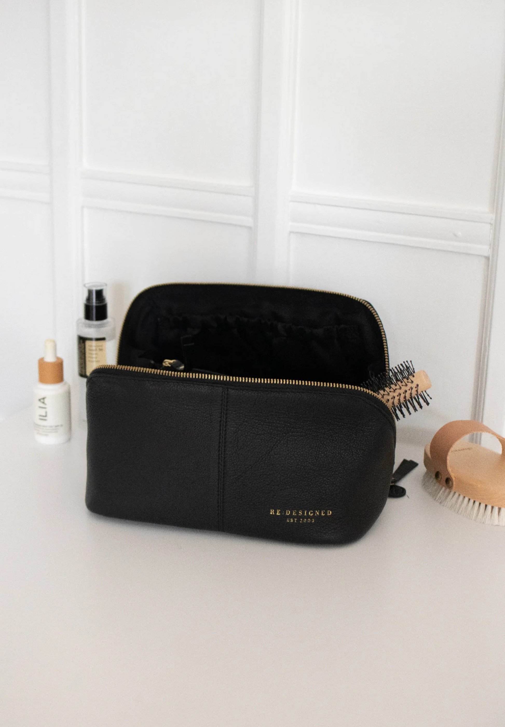 Halima liten toalettmappe er et kompakt, urbant skinn-tilbehør med gulldetaljer i metall og en tydelig innfelt gull-logo foran. Perfekt for å organisere reiseutstyr på farten.