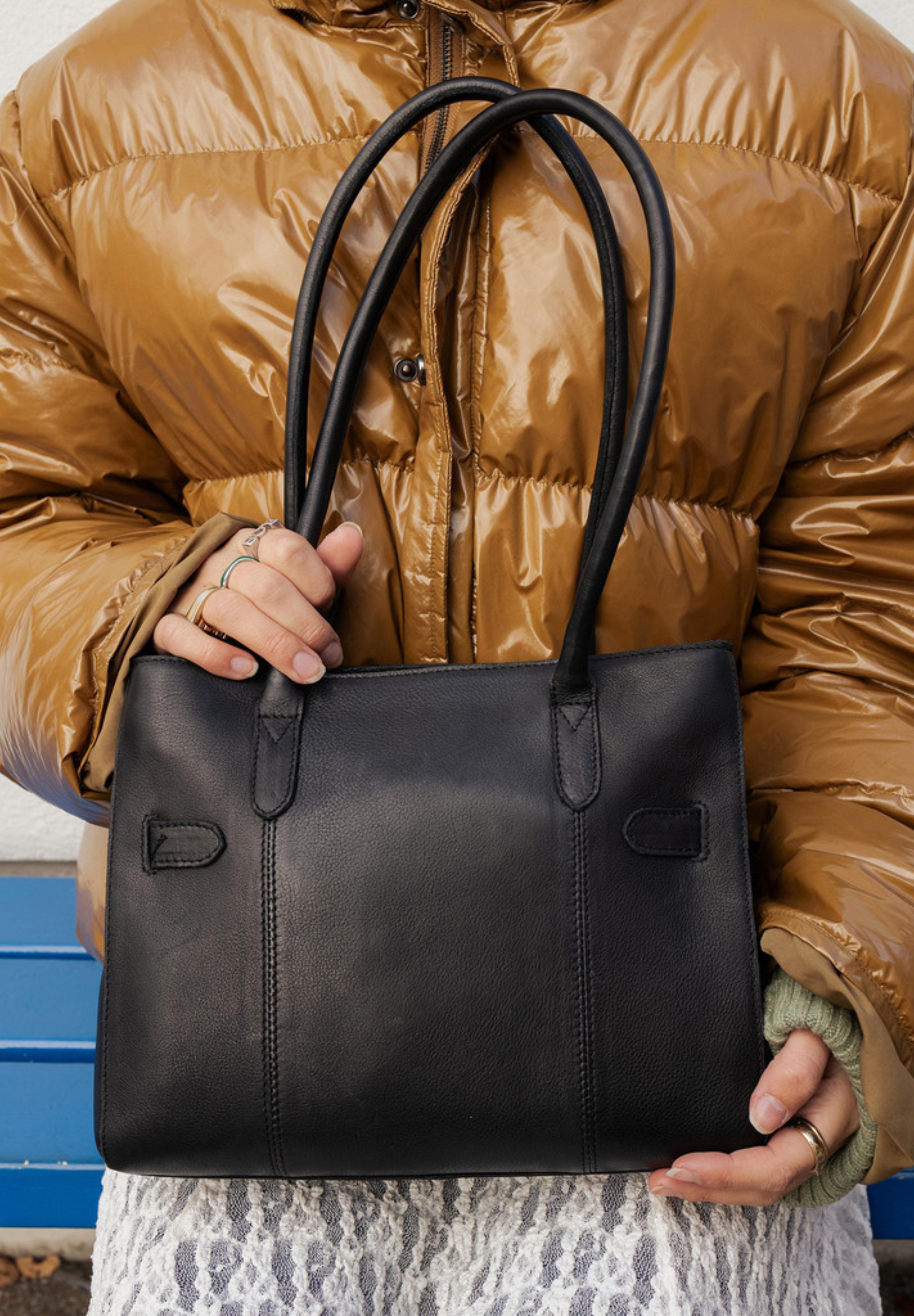 Laget i RE:Designeds Grain kvalitet. Et naturlig kornet kuskinn som trommelfarges for å bevare den opprinnelige teksturen og den myke, smidige følelsen. Hver del skjæres for hånd og poleres med voks for å oppnå en særpreget og myk finish. Denne prosessen bevarer skjønnheten i det rå skinnet, og naturlige variasjoner fremhever de unike egenskapene til hver veske.