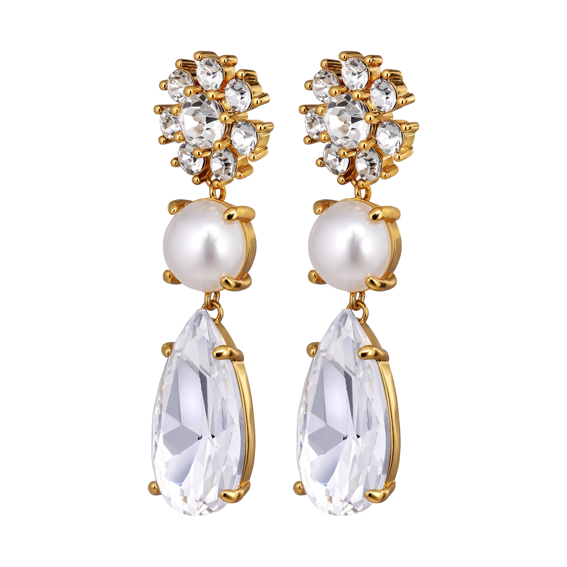 MISIA er et øredobbdesign fullt besatt med krystaller, med en øvre del formet som en krystallblomst, en midtseksjon med en hvit imitert perle og nederst en dråpeformet krystall. Vist her i en kombinasjon av klare krystaller med gulltonet finish.