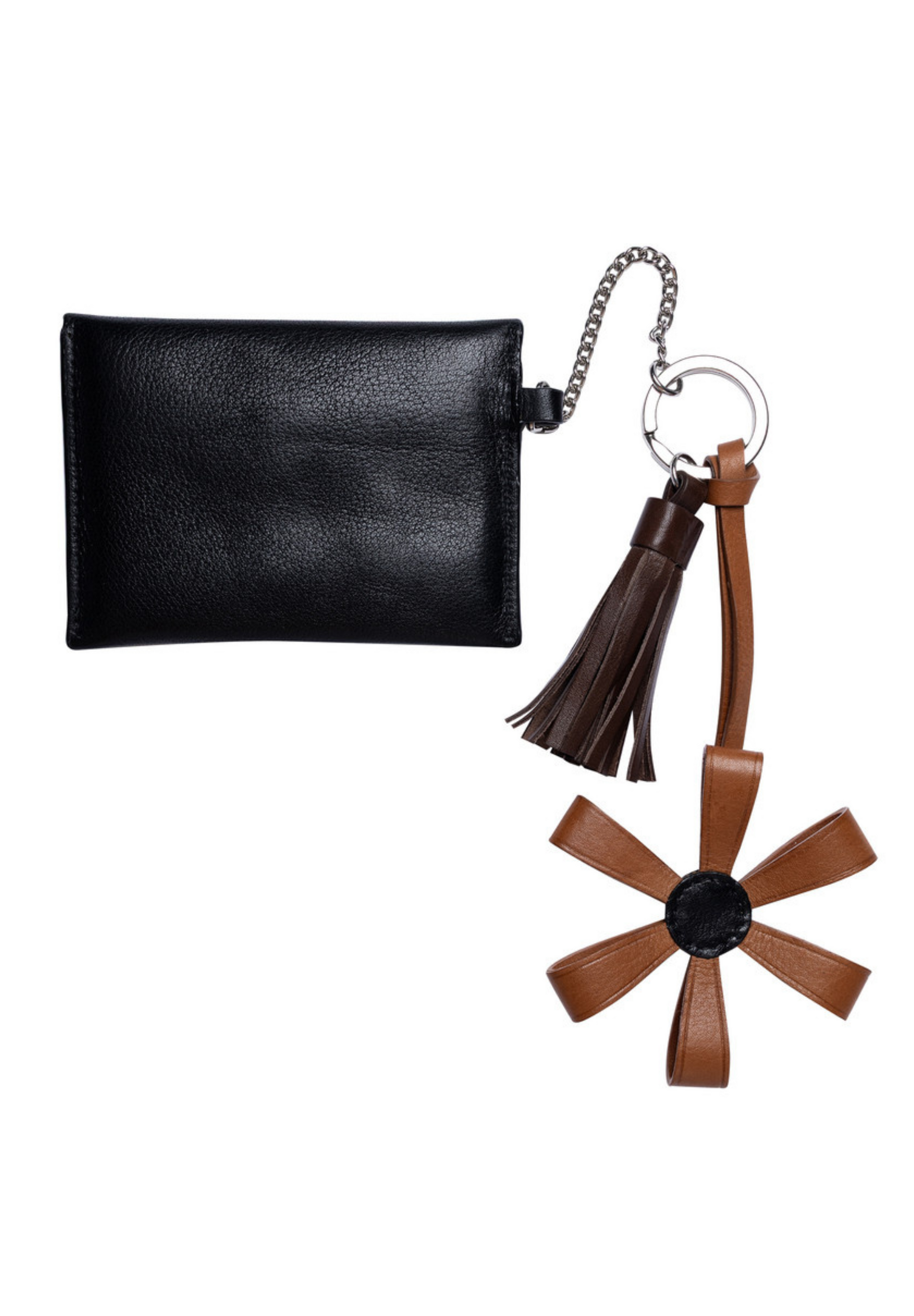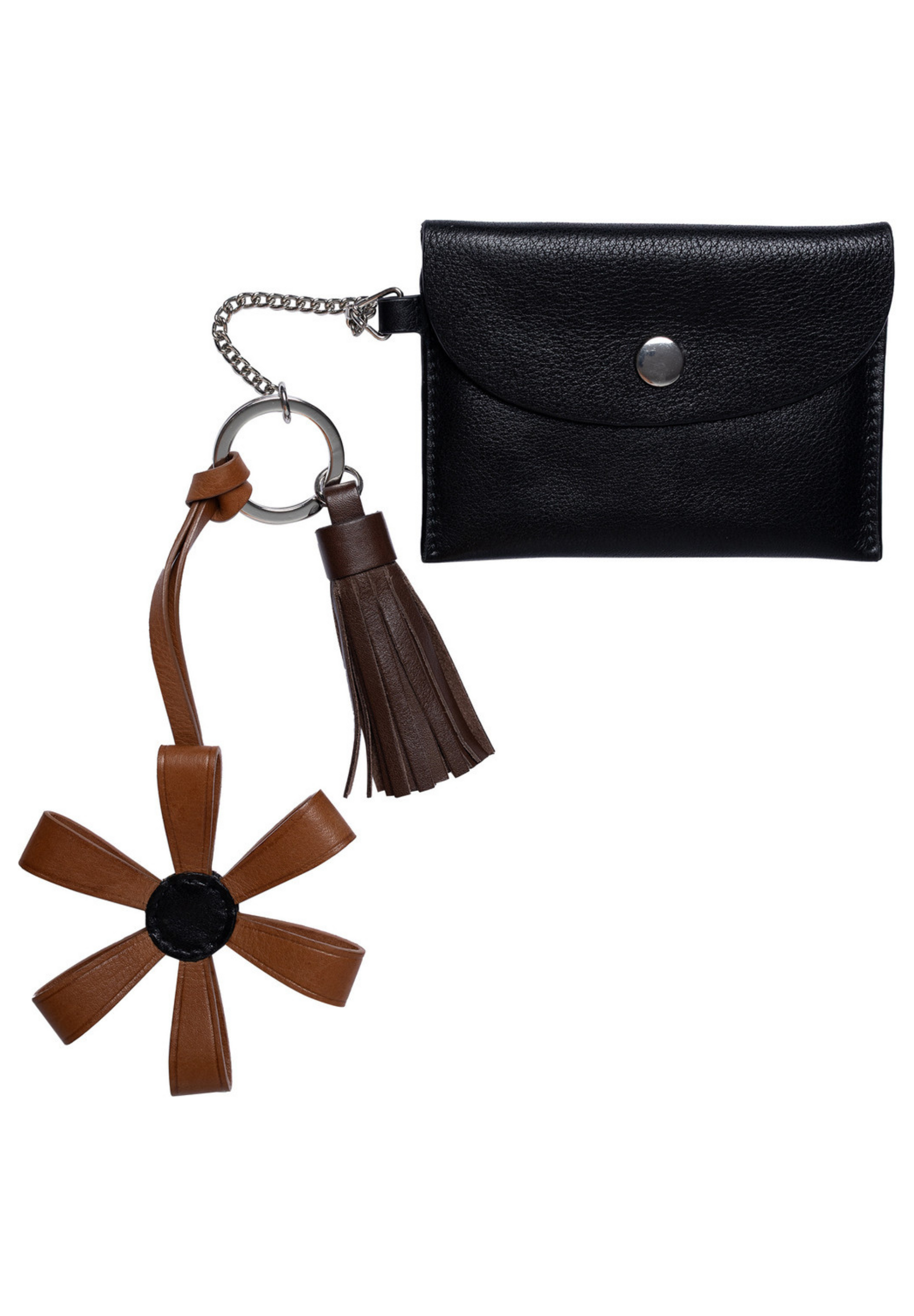 Nela er en sjarmerende liten nøkkelring med dusk, blomsterdetalj og en liten lommebok som lukkes med trykknapp.