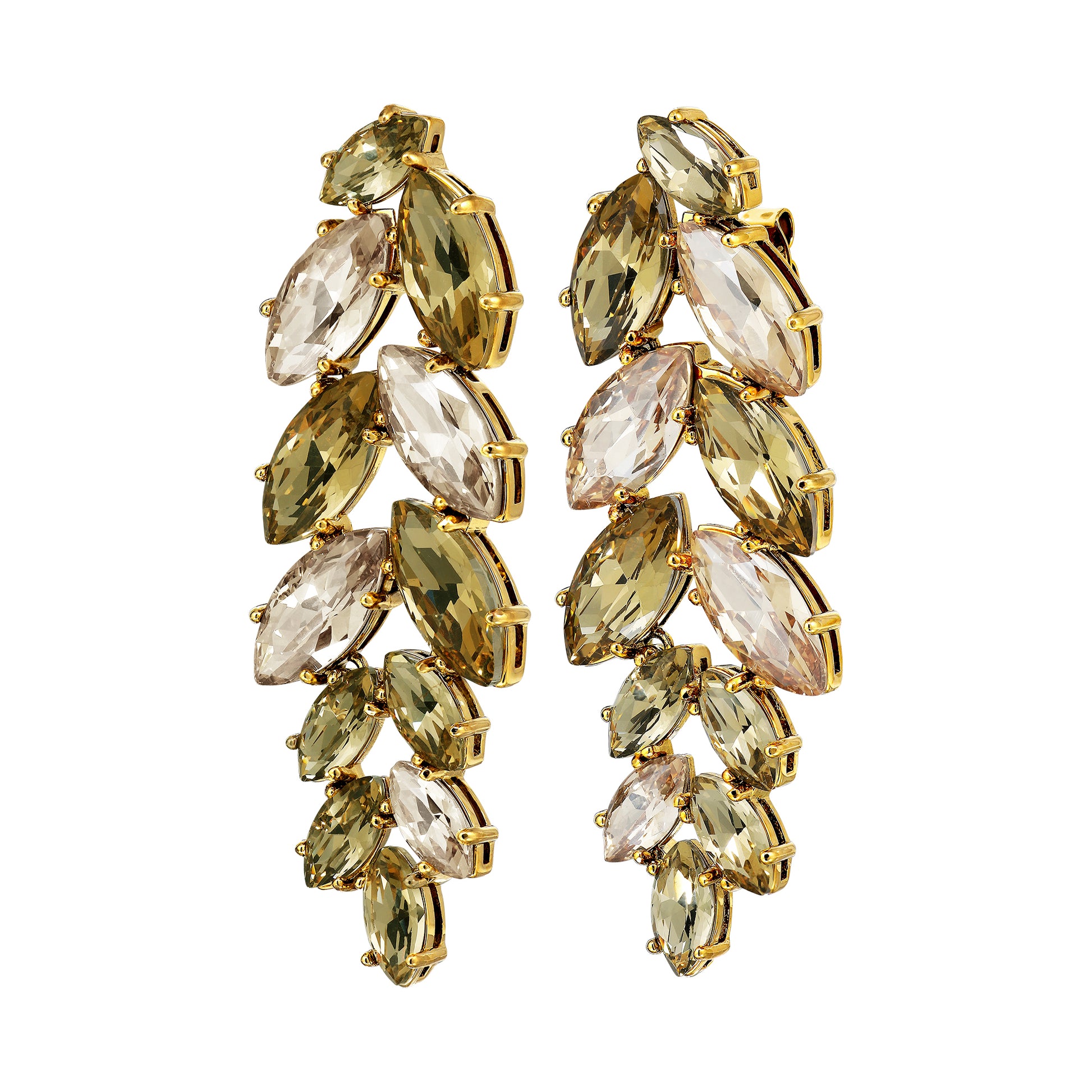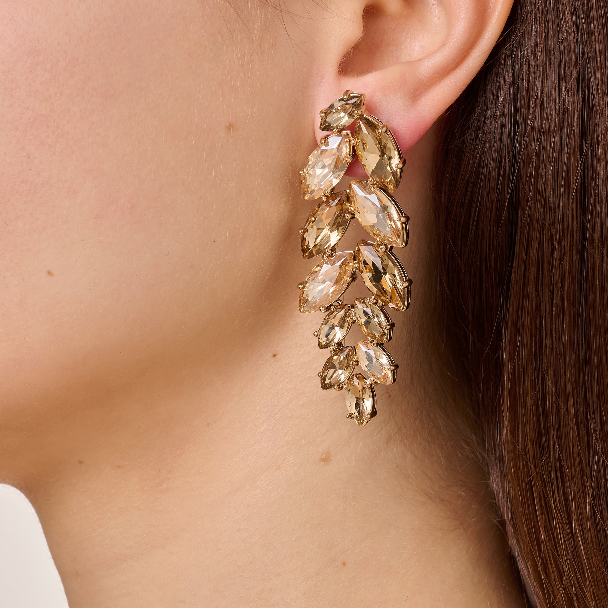 BANYAN er et øredobbdesign med hele tolv navetteformede, fasettslipte krystaller i et sammenhengende mønster som skaper en illusjon av krystallblader som smyger seg langs halslinjen. Her vist i en miks av gyldne krystaller med gulltonet finish.