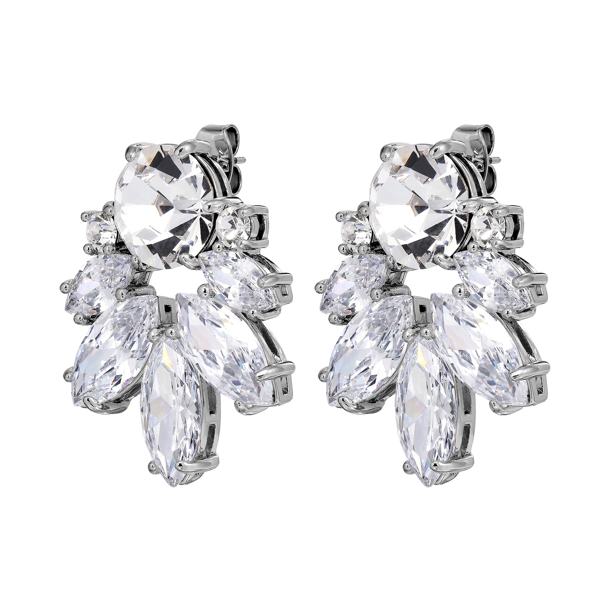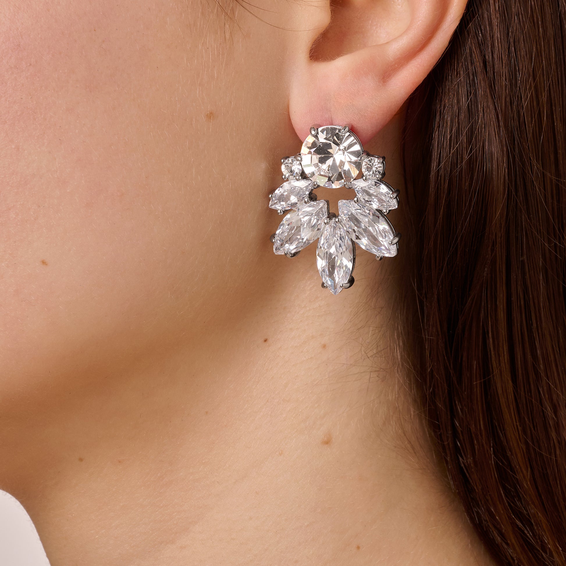 DRAGO er et øredobbdesign med en halvsirkel av bladformede krystaller som omkranser en større, rund kontrastfarget sten. Vist her med klassiske hvite krystaller i sølvtonet finish.