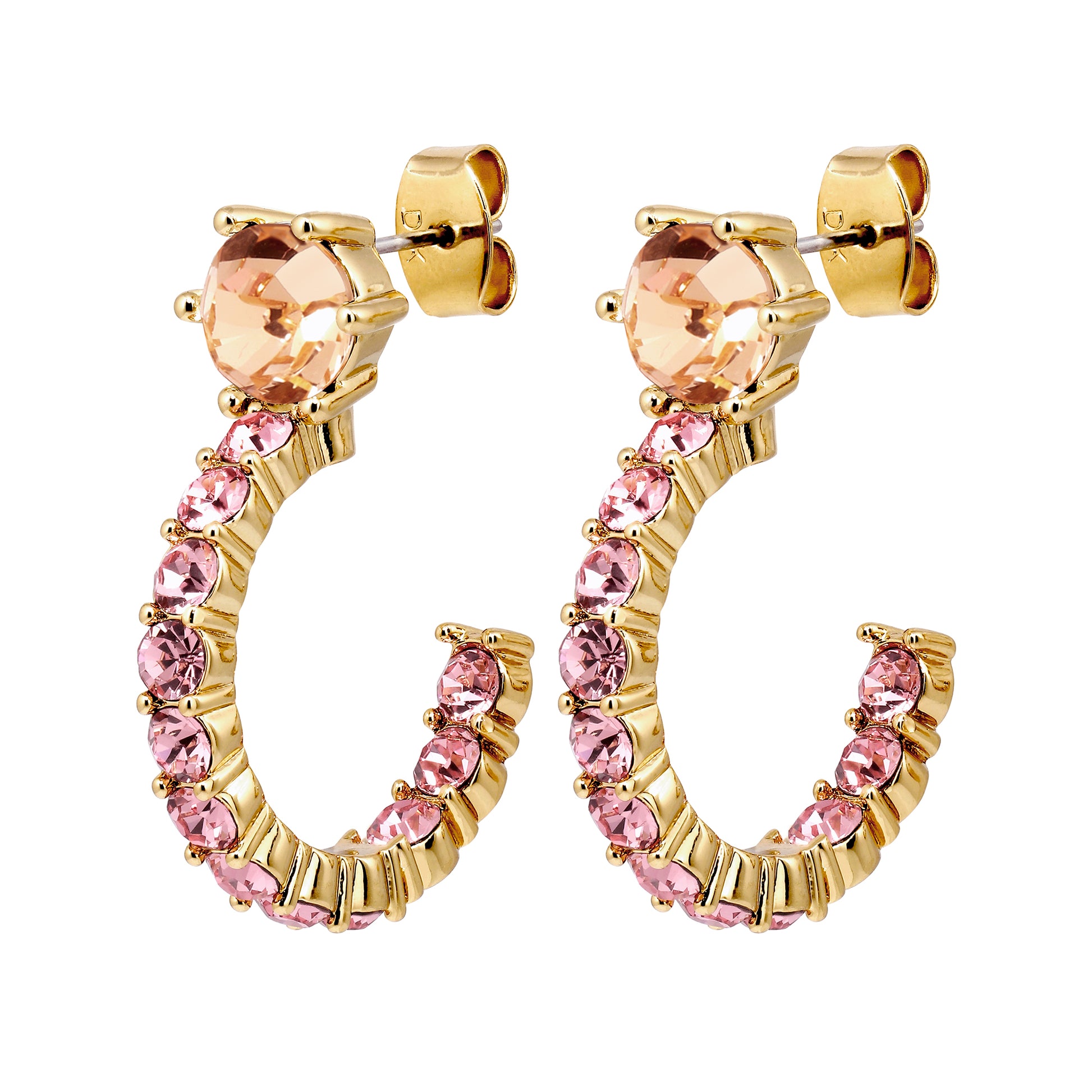ESPRIT er en ny vri på den klassiske hoop-øredobben: En kloinnfattet chaton-krystall sitter over en 22 mm hoop, rikt dekorert med flere fasettslipte krystaller. Her vist med rosafargede krystaller og gullfarget finish.