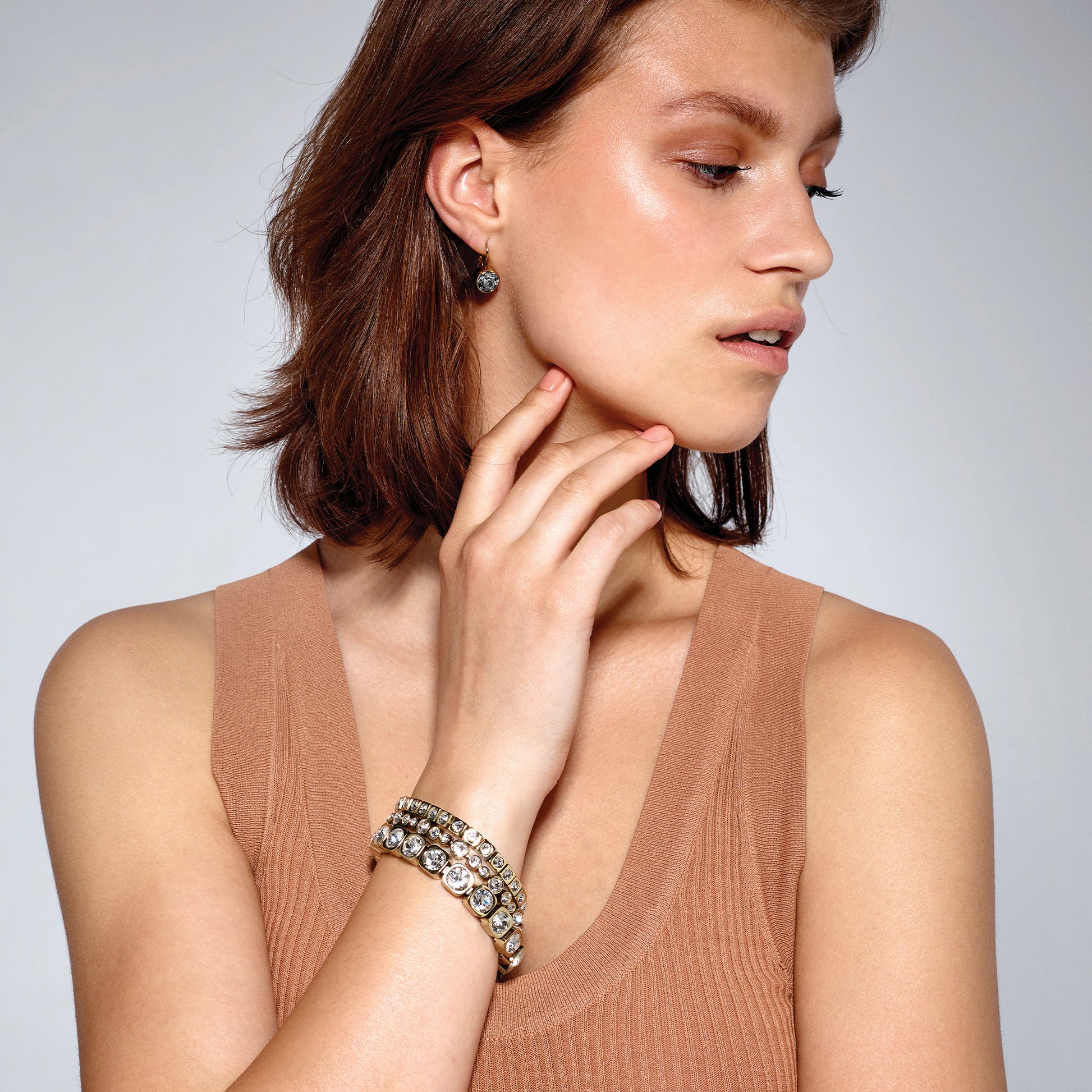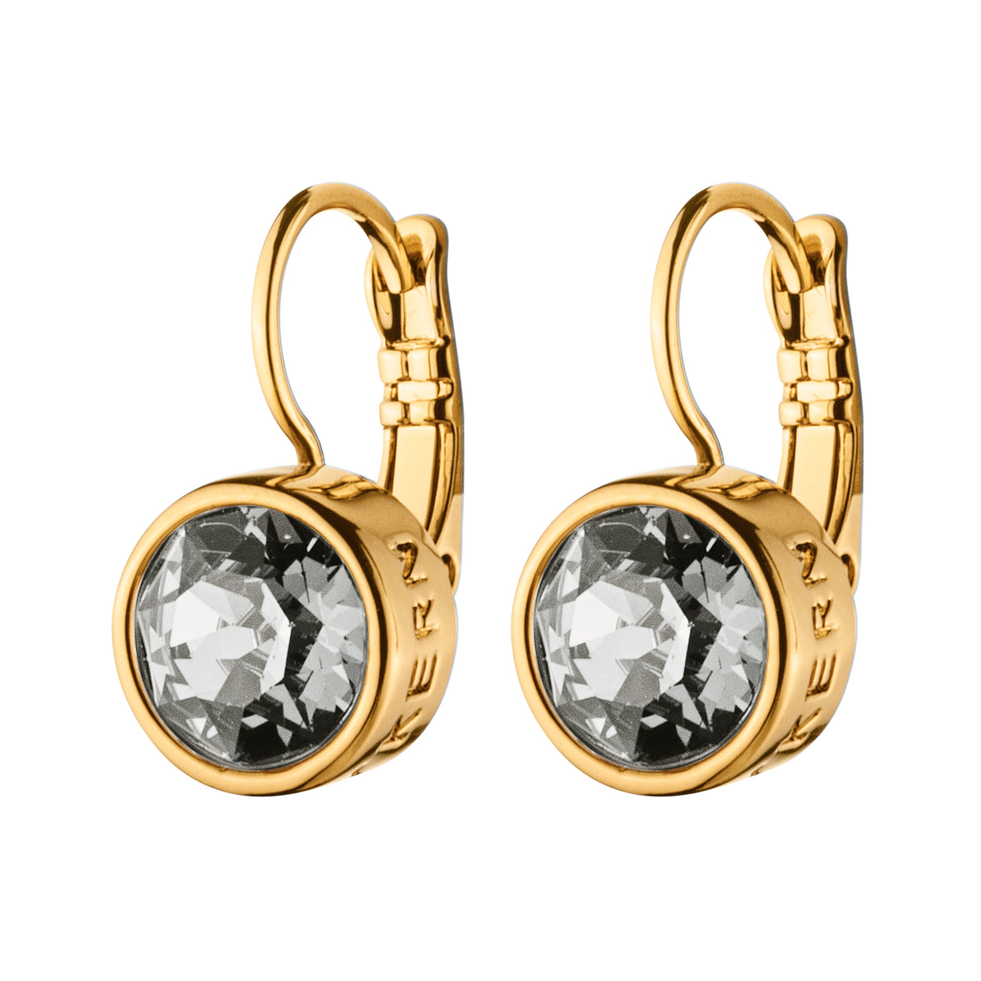LOUISE er en bestselger og klassiker som kommer i nye farger hver sesong. Den har en rund fasettslipt krystall på ca. 1 cm i diameter som er satt i en boksinnfatning og festet til en lukket krok. Her vist i gulltonet finish med gråtonede krystaller.