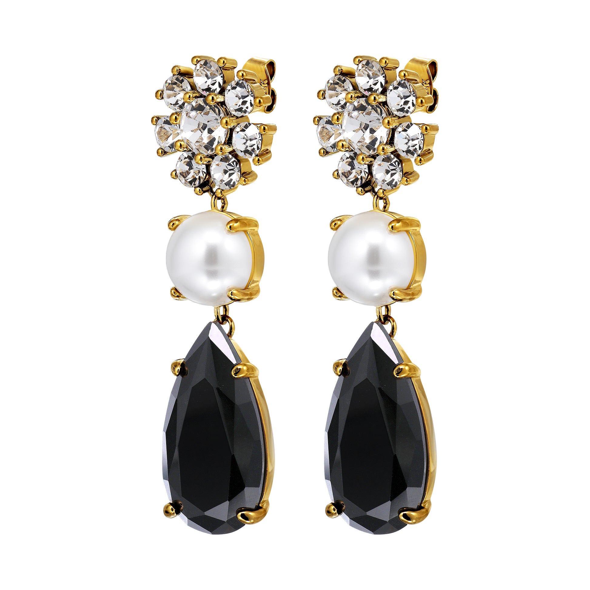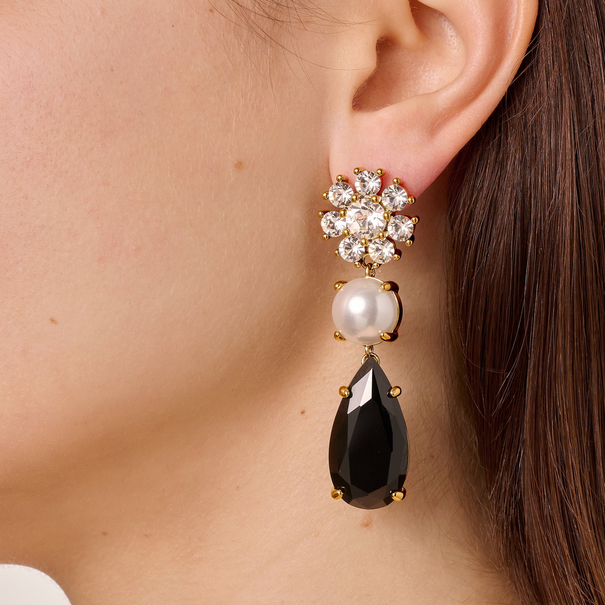 MISIA er et øredobbdesign fullt besatt med krystaller, med en øvre del formet som en krystallblomst, en midtseksjon med en hvit imitert perle og nederst en dråpeformet krystall. Vist her i en kombinasjon av klare krystaller og jettsvarte detaljer med gulltonet finish.