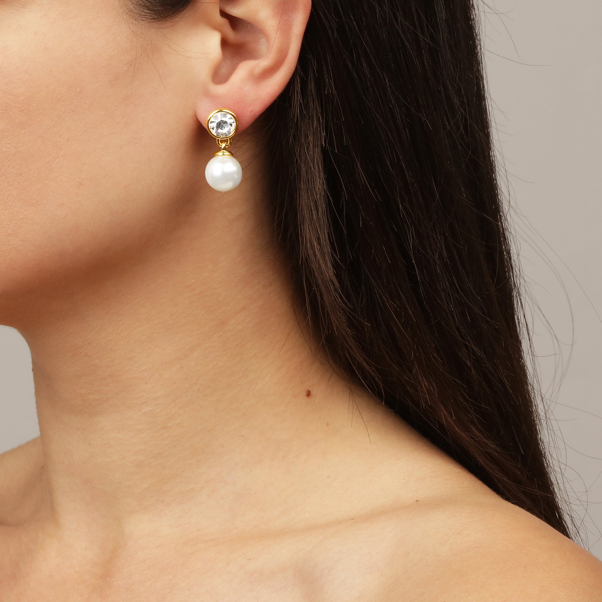 NAOMI er et øredobbdesign med en stor fasettslipt krystall satt i en boksinnfatning, underlagt en hengende hvit imitert perle. Vist her med klar krystall og hvit perle på gullfarget metall.