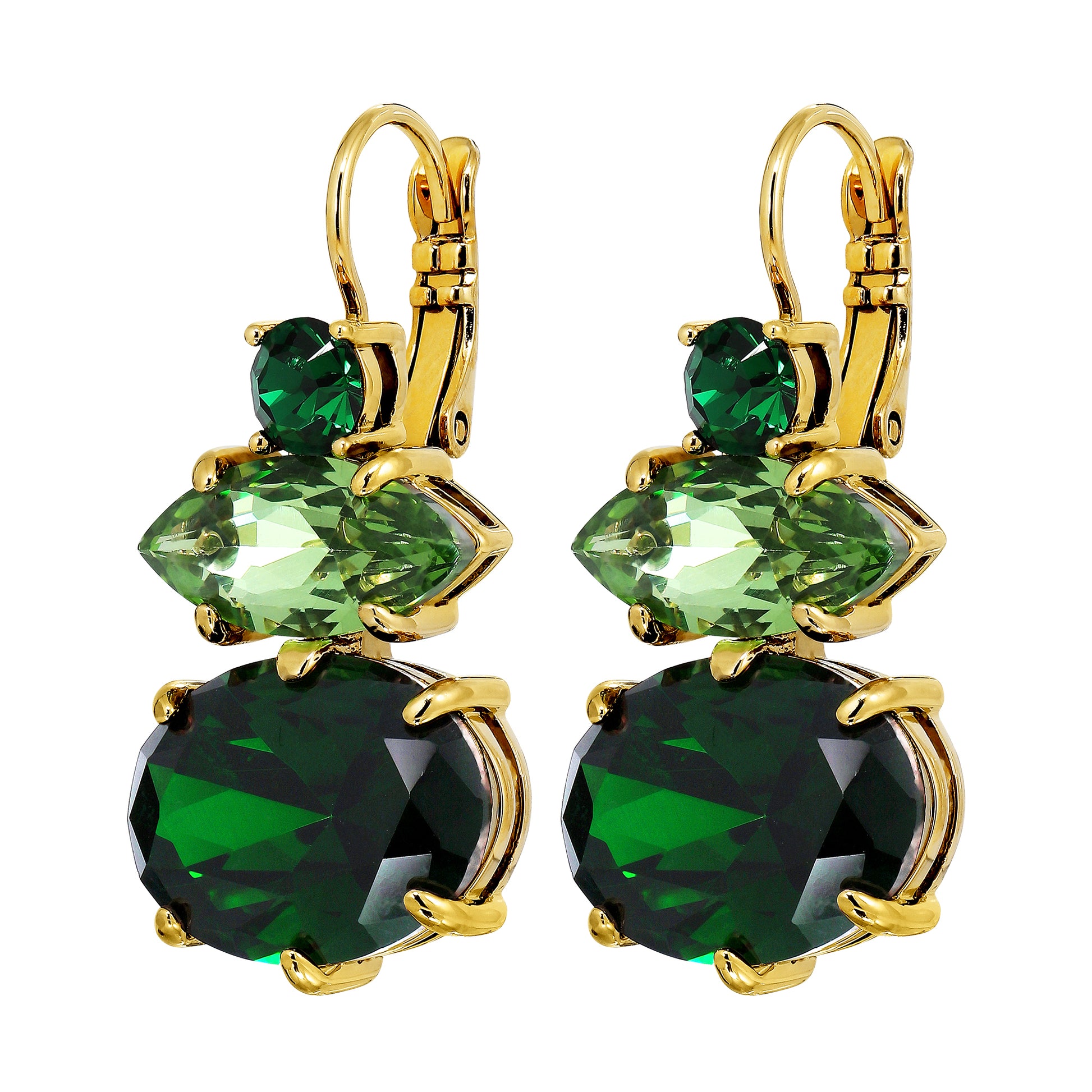 PARSANA er et øredobbdesign med lukket krok og tre fasettslipte krystaller i ulike størrelser og former. Her vist i grønne og smaragdgrønne nyanser med gulltonet finish.