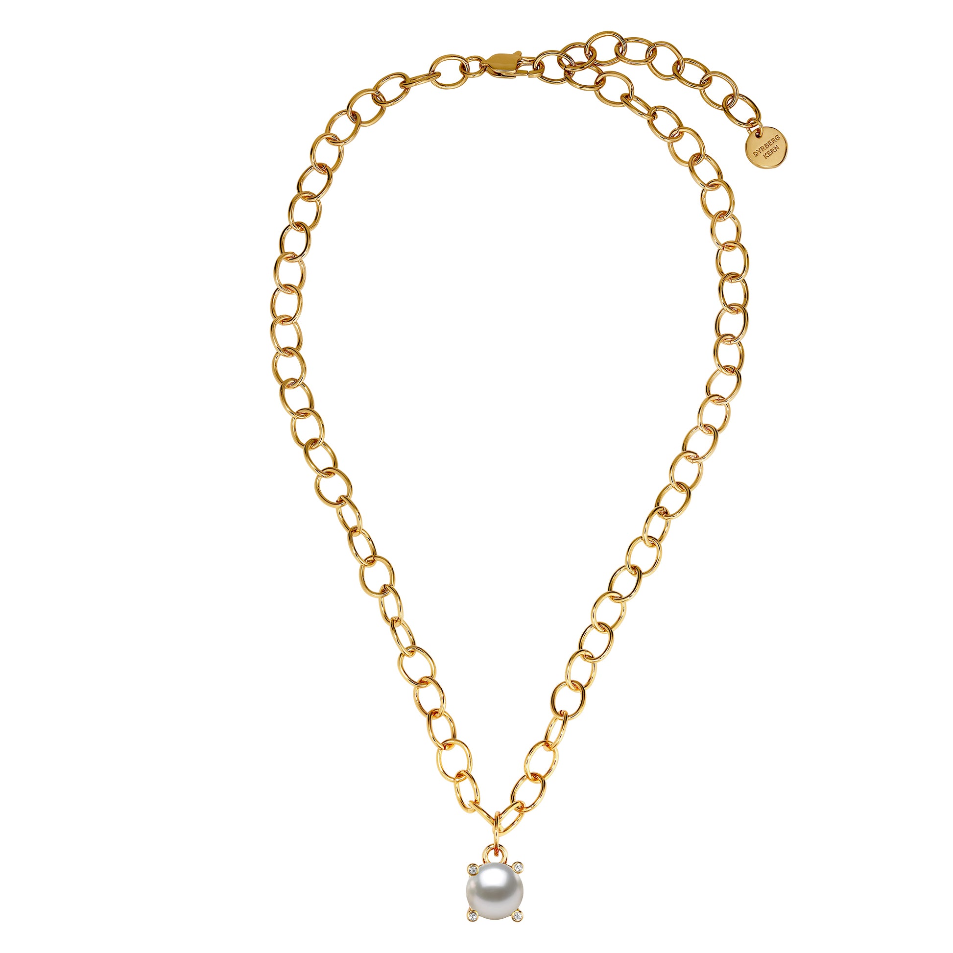 RAMINA er et halskjede med et markant anheng flankert av fire mindre kontrastfargede krystaller. Kjedet er ca. 45 cm langt med en forlengelseskjede på 5 cm, og anhenget måler ca. 18 mm i diameter. Her vist med en hvit imitert perle i gulltonet finish.
