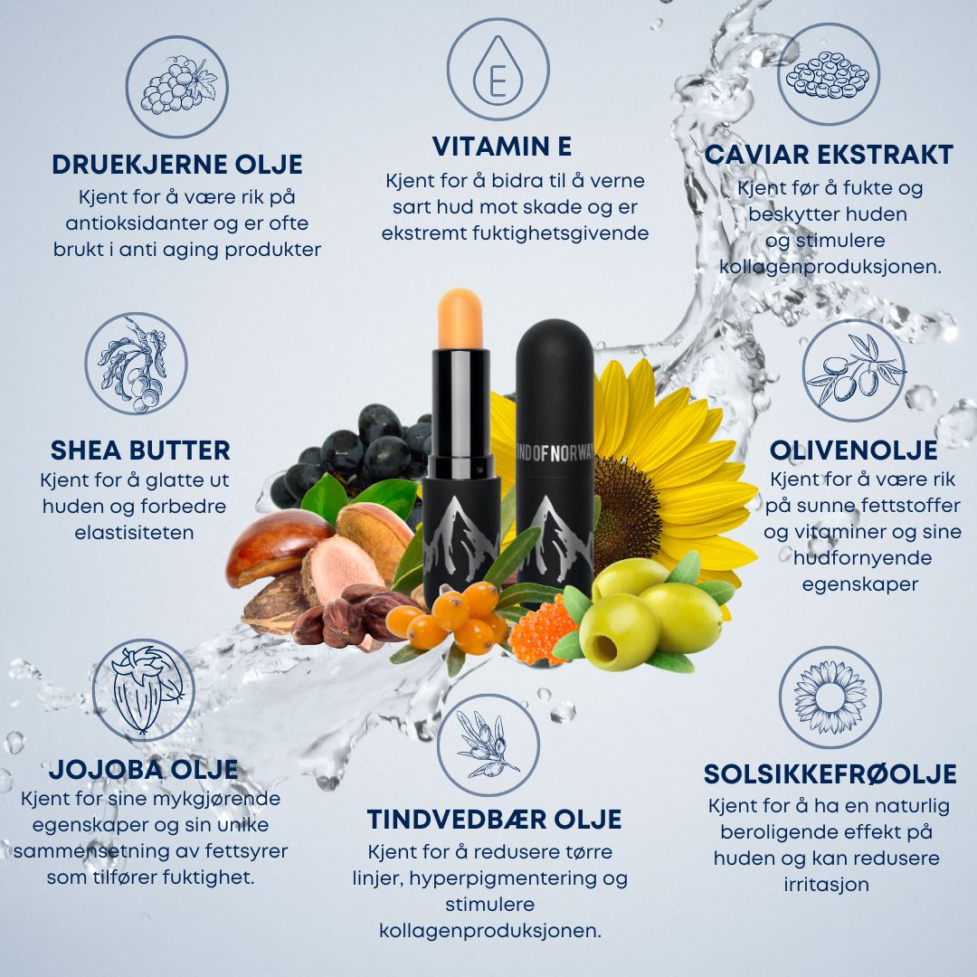 TINDbalm er en nærende og pleiende leppebalm som beskytter og mykgjør tørre lepper. Den inneholder naturlige ingredienser som jojobaolje, sheasmør, solsikkefrøolje, druekjerneolje, olivenolje, vitamin E, tindvedbærolje og kaviar-ekstrakt som tilfører fukt og næring hele dagen.